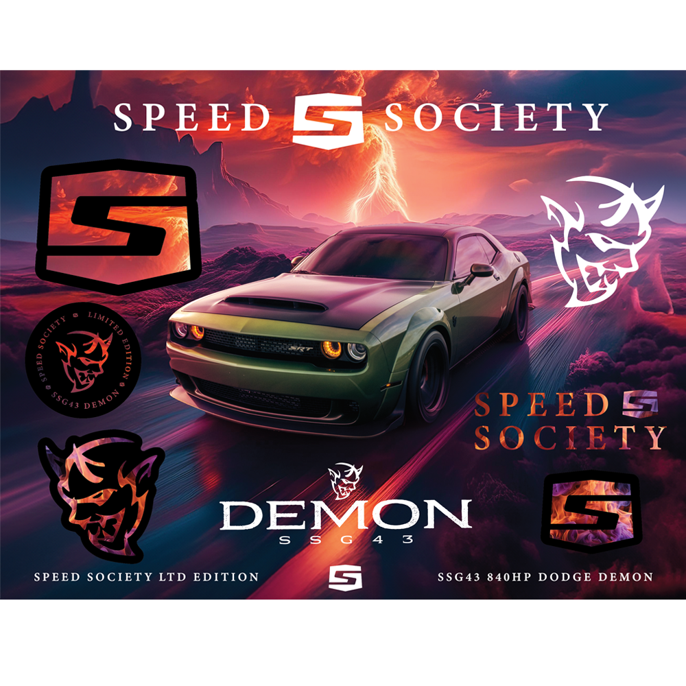 Unleash the spirit of pure performance with our exclusive SSG43 Dodge Demon Limited Edition Sticker Sheet, crafted to celebrate the 43rd Speed Society giveaway! This vibrant collection is a tribute to the raw power of the 840HP Dodge Demon, a beast known for dominating both the streets and the strip.