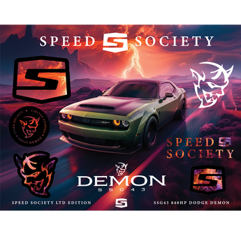 Featuring an array of bold designs, including the iconic Speed Society Icon and the menacing Demon emblem, each sticker is infused with the essence of speed and adrenaline. The high-definition artwork captures the fierce energy of the SSG43 Demon, set against a striking backdrop of fiery reds and cool purples, reminiscent of the intense journey this muscle car promises.
