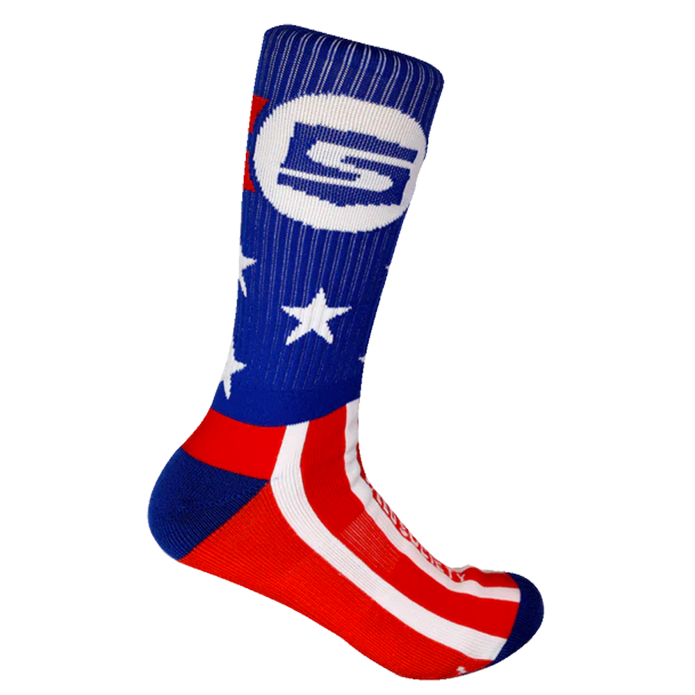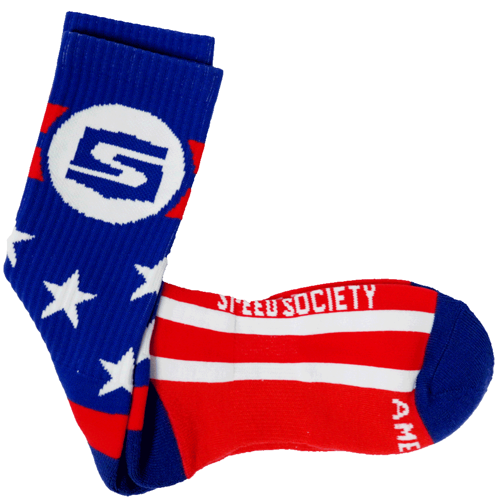 Show your patriotic spirit down to your toes with our 'Pledge' red, white and blue Jacquard socks. Featuring our Speed Society icon on the ankle surrounded by red stripes and white stars with a red and white striped bottom, these are the ultimate patriots sock.
