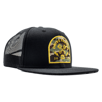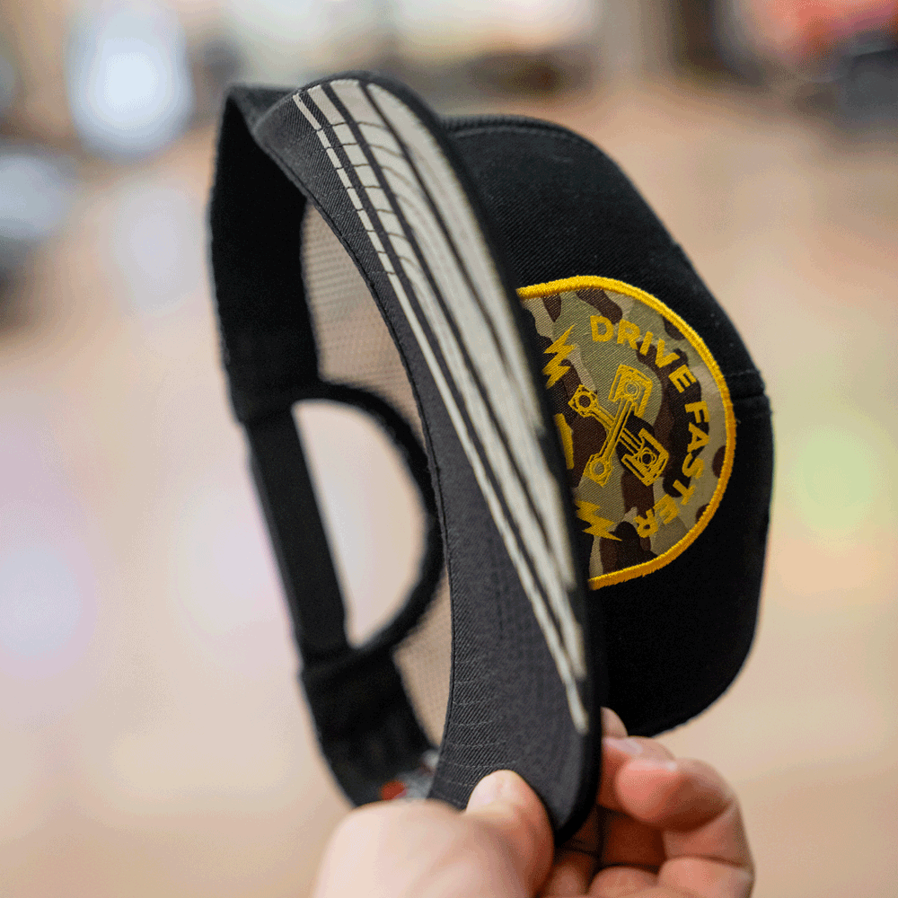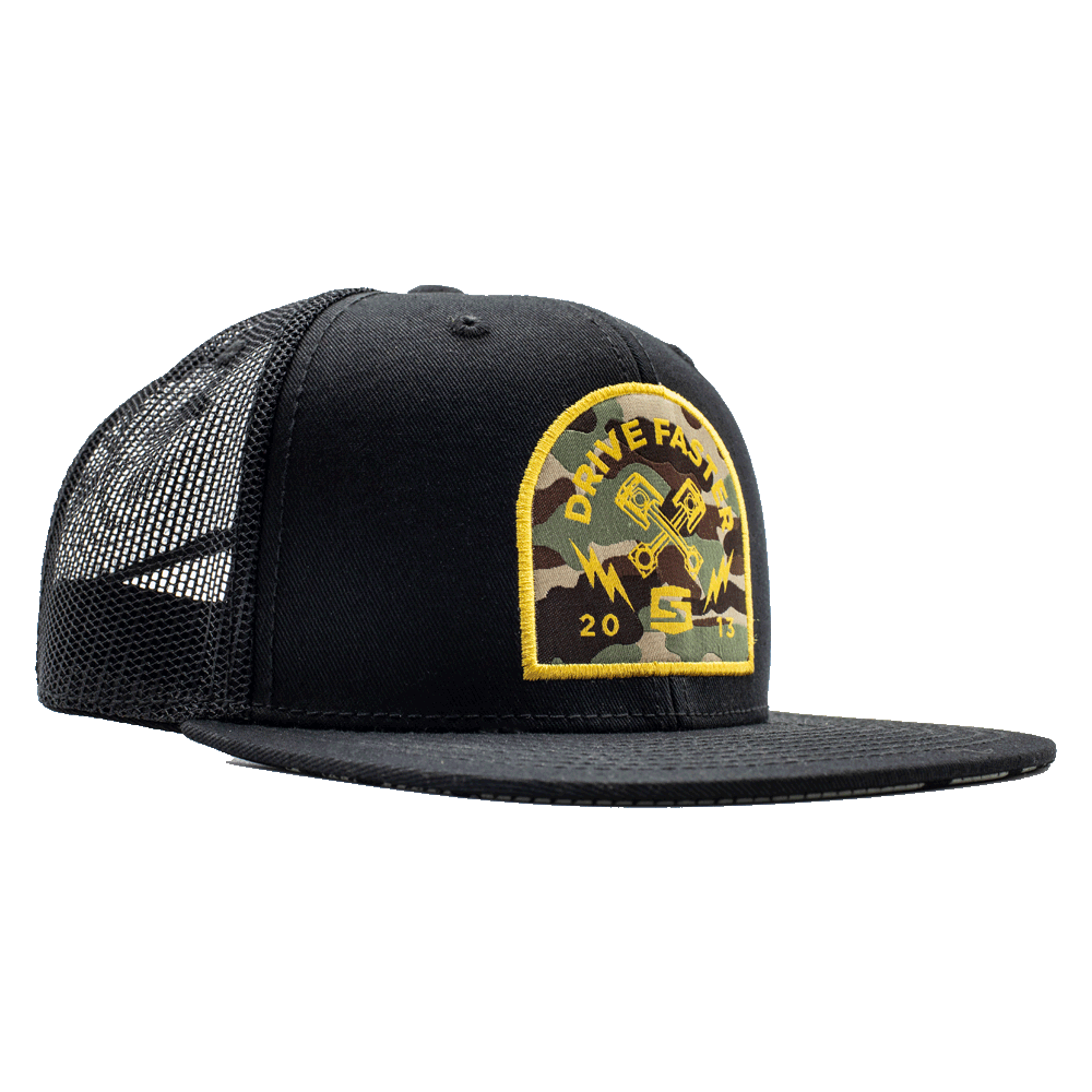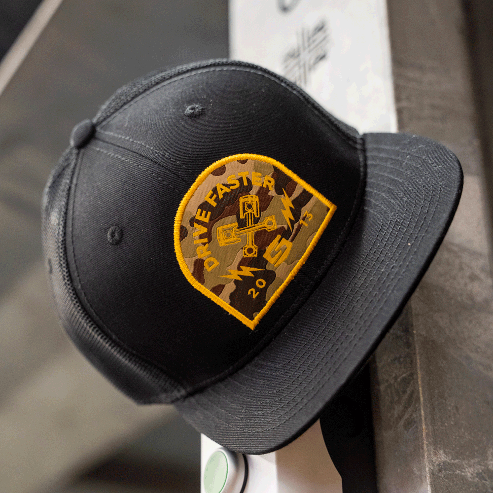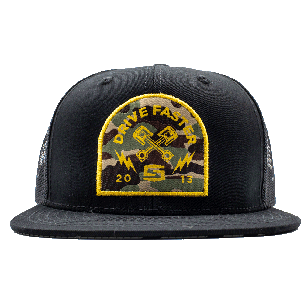 Strike first, and strike fast like lightning. If that's your motto, then this is the hat for you! Lightning features a stitched patch camo pattern design with one of our favorite mantras, Drive Faster, along with crossed pistons, a pair of lightning bolts, our Speed Society icon, and our established date of 2013.