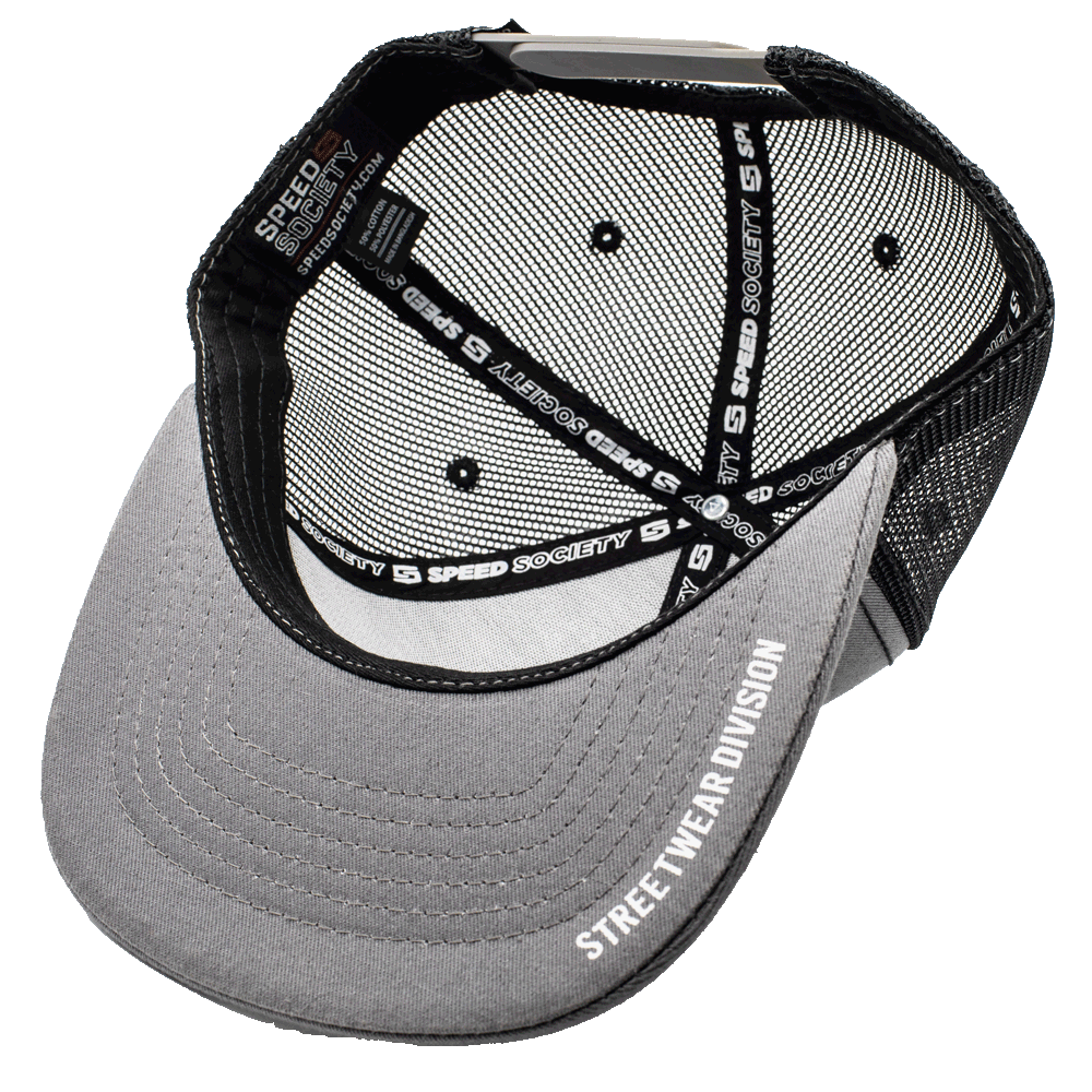Channeling your clean and contemporary side with this sharp black, white, and grey-themed premium fit six-panel hat named Streetwear Division. Featuring a geometric black and white Speed Society patch stitched right into the front grey panels and custom-printed Streetwear Division on the underside of the bill.